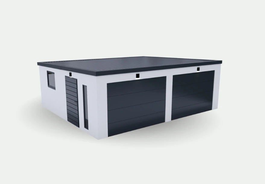 Montovaná dvojgaráž Deluxe spojuje moderní vzhled s robustní konstrukcí a rychlou montáží. Díky ocelovému rámu, omítkové povrchové úpravě a volitelnému zateplení je téměř k nerozeznání od zděných garáží. Garáž je navržena pro dvě auta se společnou střechou, lze přidat dělící příčku, zvolit typ vrat (sekční, výklopná), přidat okna, dveře nebo přístřešek.