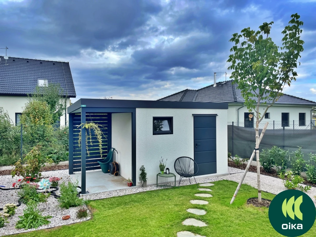 Zahradní domek s přístřeškem, který na zahradě perfektně funguje i vypadá.